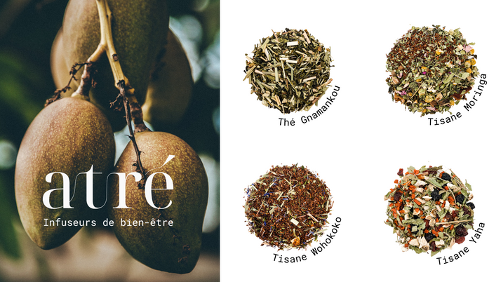 Atré est une marque française de thés et tisanes biologiques inspirée par les plantes africaines. Son but est d'apporter un bien-être constant en proposant une solution naturelle à chaque maux du quotidien. Studio nane a réalisé l'univers de marque, branding, site internet, packaging, templates graphiques des réseaux sociaux ainsi que la direction artistique du shooting.